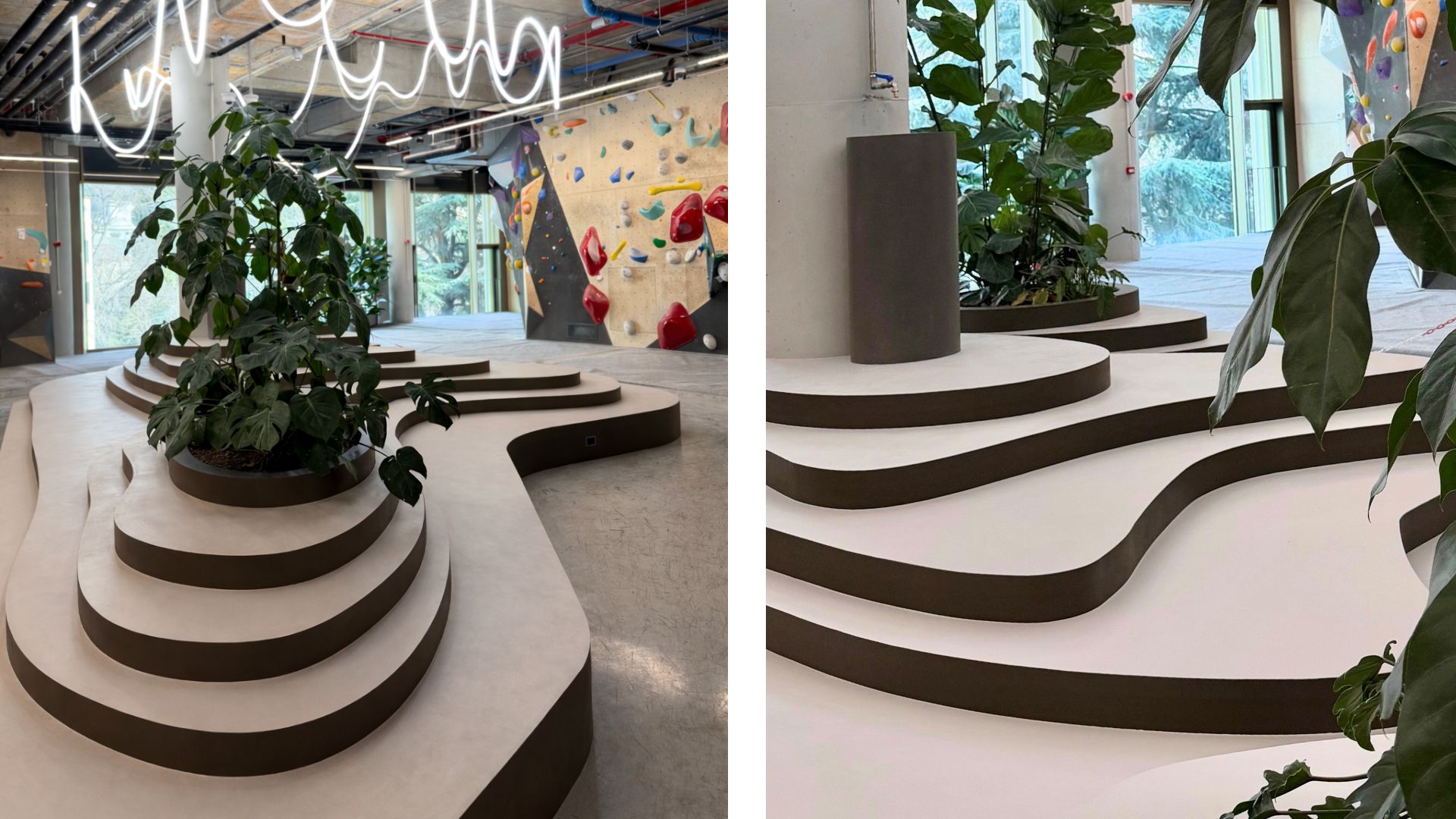 Nel cuore della palestra spicca la pedana, un'autentico spazio di incontro. Un’area pensata per il relax e la condivisione, che mettere in relazione gli ambienti e accompagna in modo naturale i flussi all’interno dell'impianto.